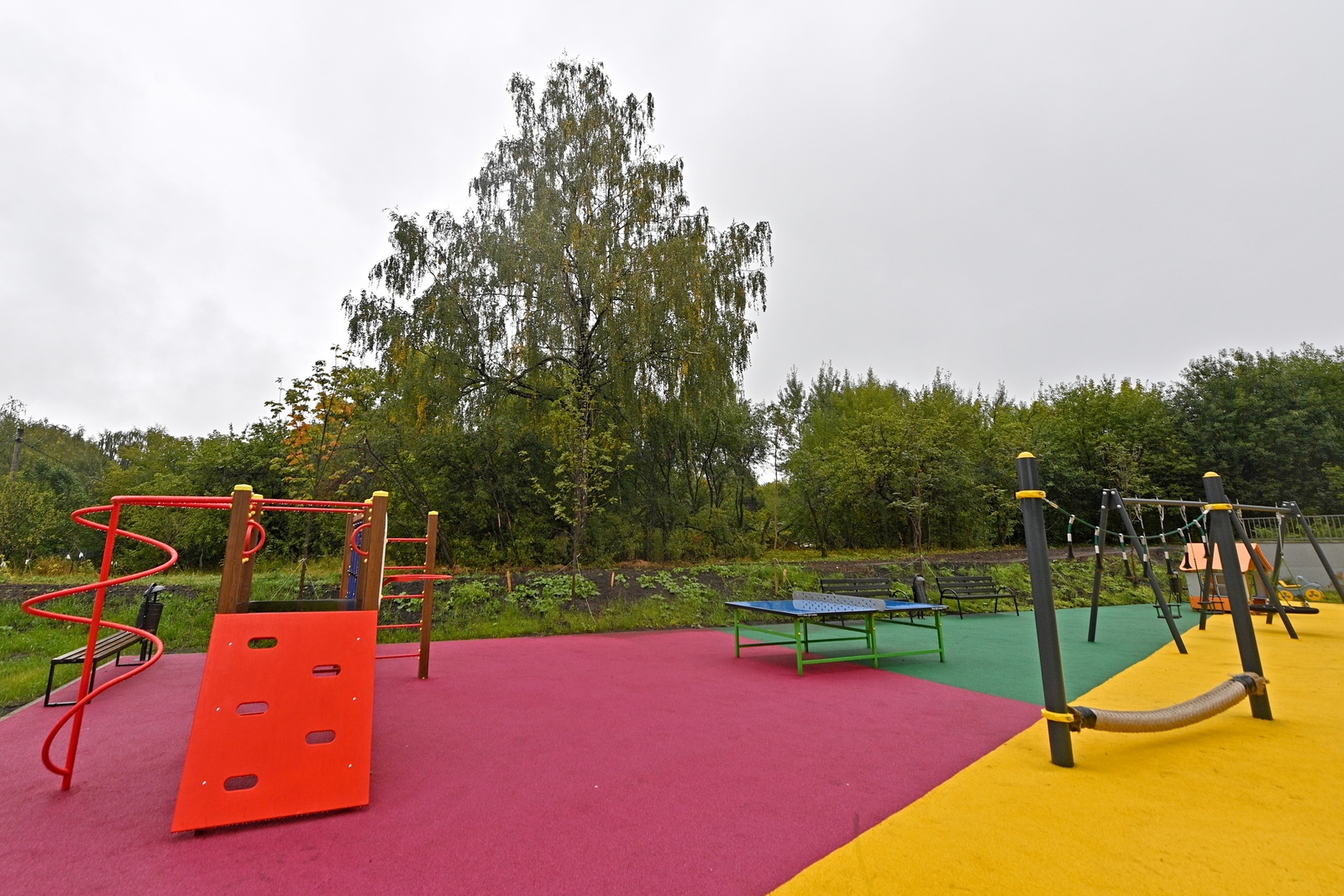 На детских площадках для безопасности укладывают резиновое покрытие, устанавливают игровые комплексы, качели, песочницы, горки, лабиринты.
