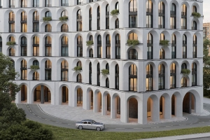 Один из вестибюлей будет с трех сторон окружен колоннами необычной формы – их выполнят в виде больших конусов, расширяющихся вверх и подсвечиваемых изнутри. Между ними установят витражи с алюминиевым профилем черного цвета. Отделку выполнят белыми алюминиевыми панелями. Для подсветки фасадов используют светильники, расположенные на выступающих фрагментах и закрепленные на колоннах, что позволит придать зданию большую выразительность.