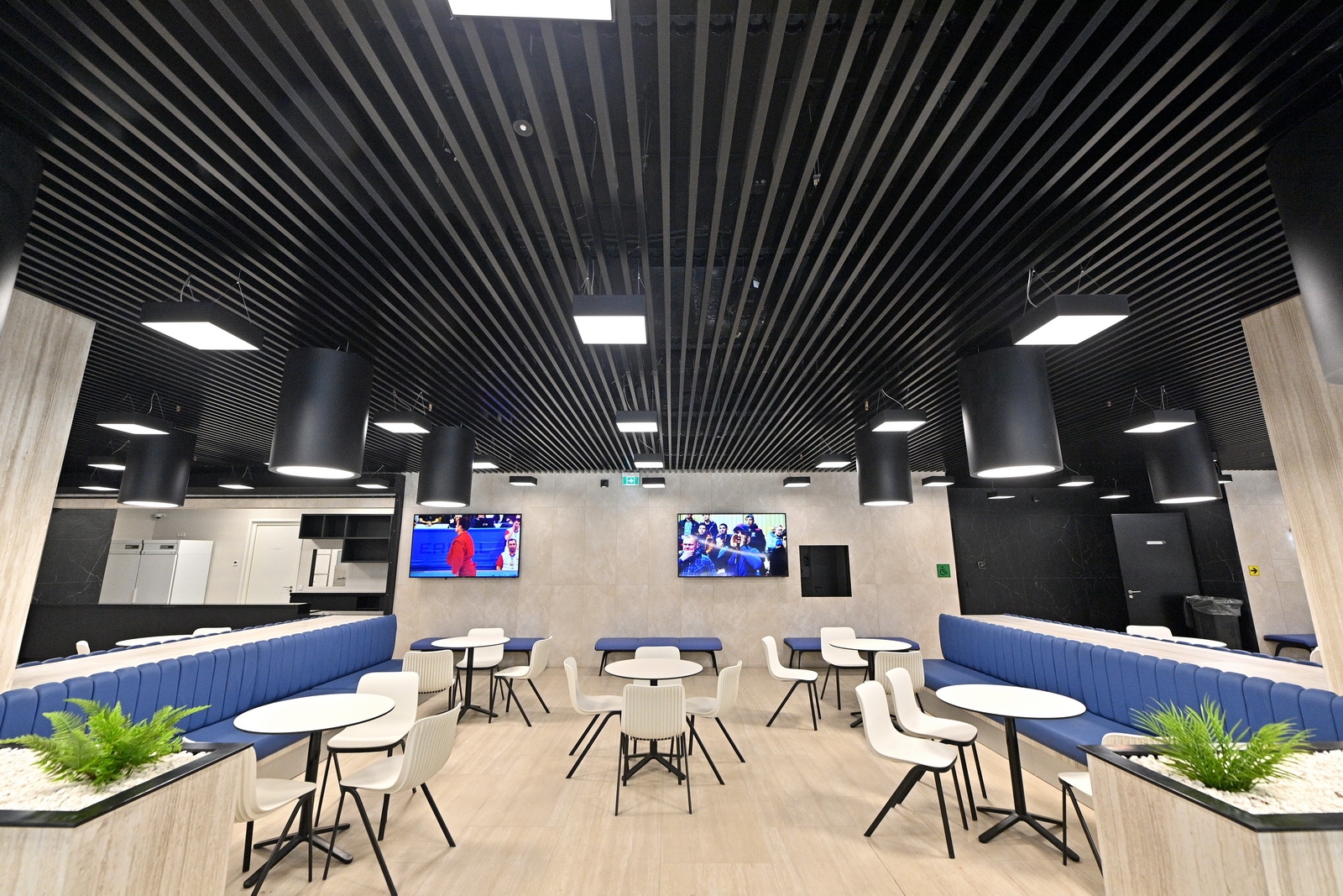 Центр самбо занимает северо-западную часть здания, центр бокса – юго-восточную. В каждом блоке предусмотрен просторный холл с большими медиаэкранами, выполненный в светлом лаконичном дизайне.