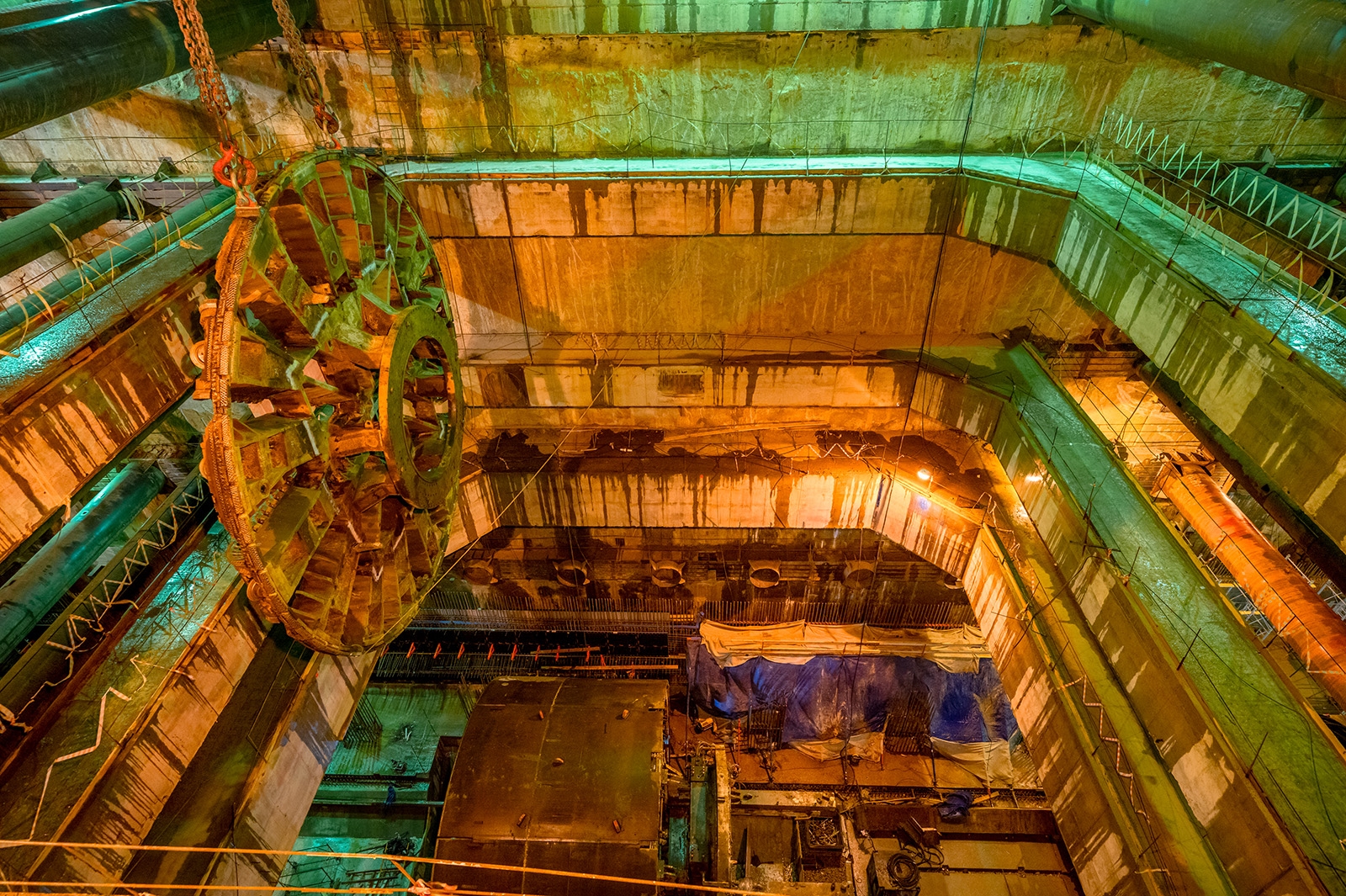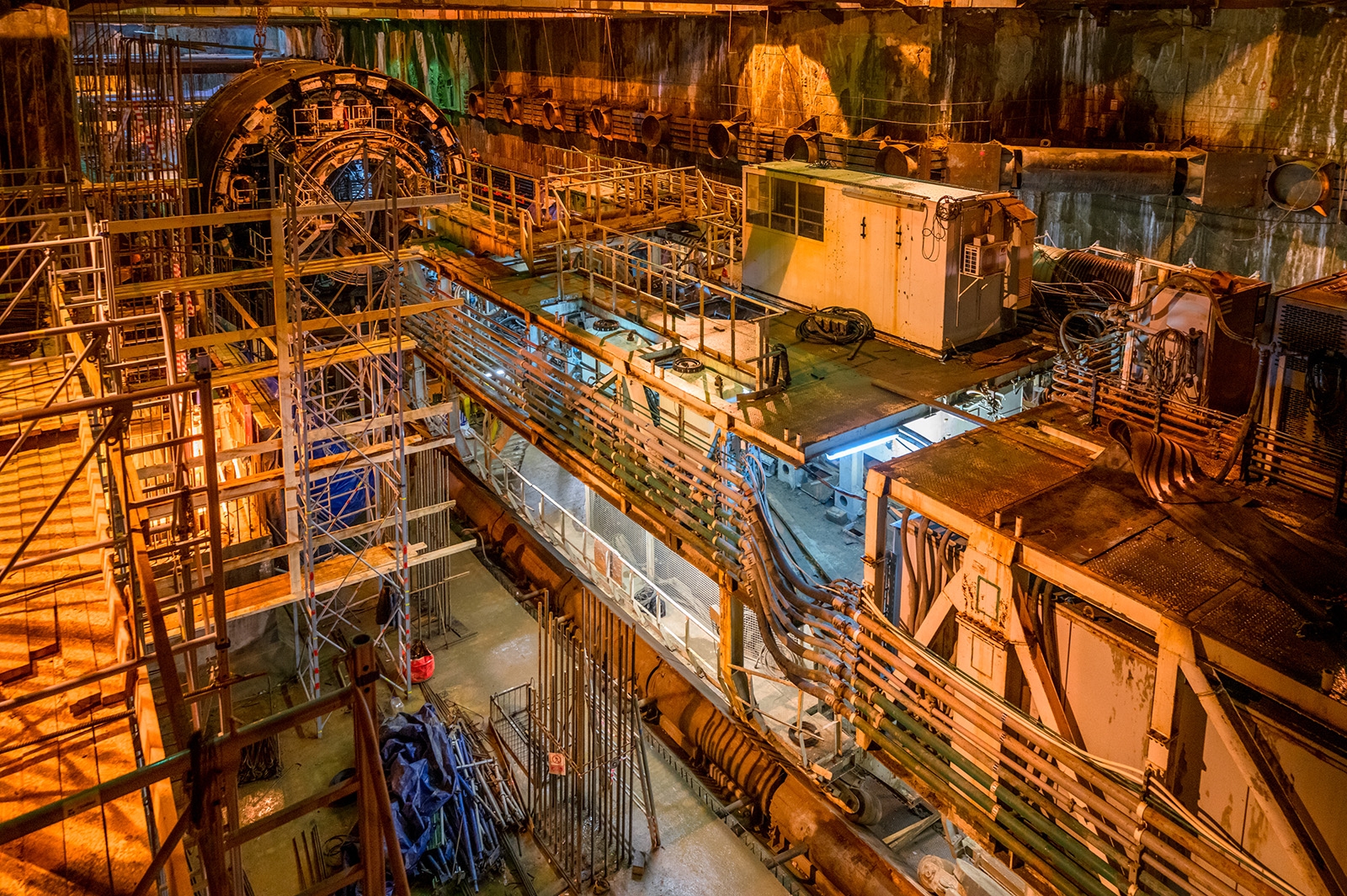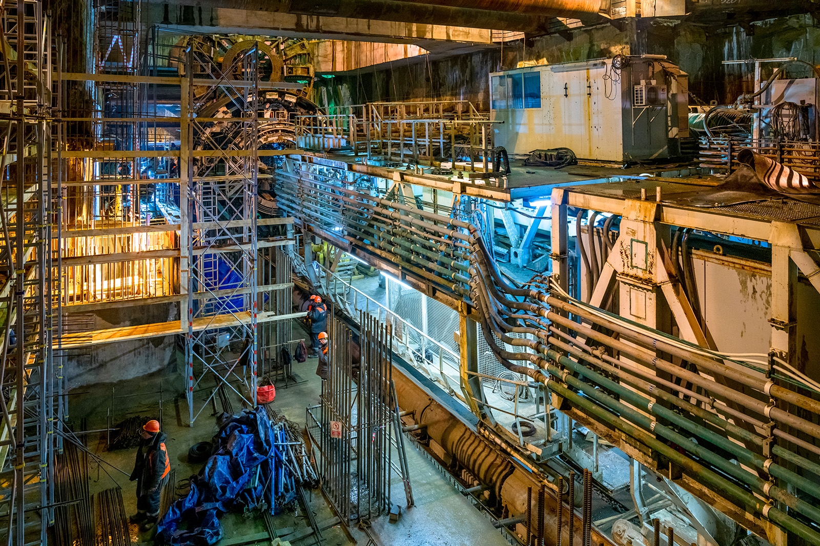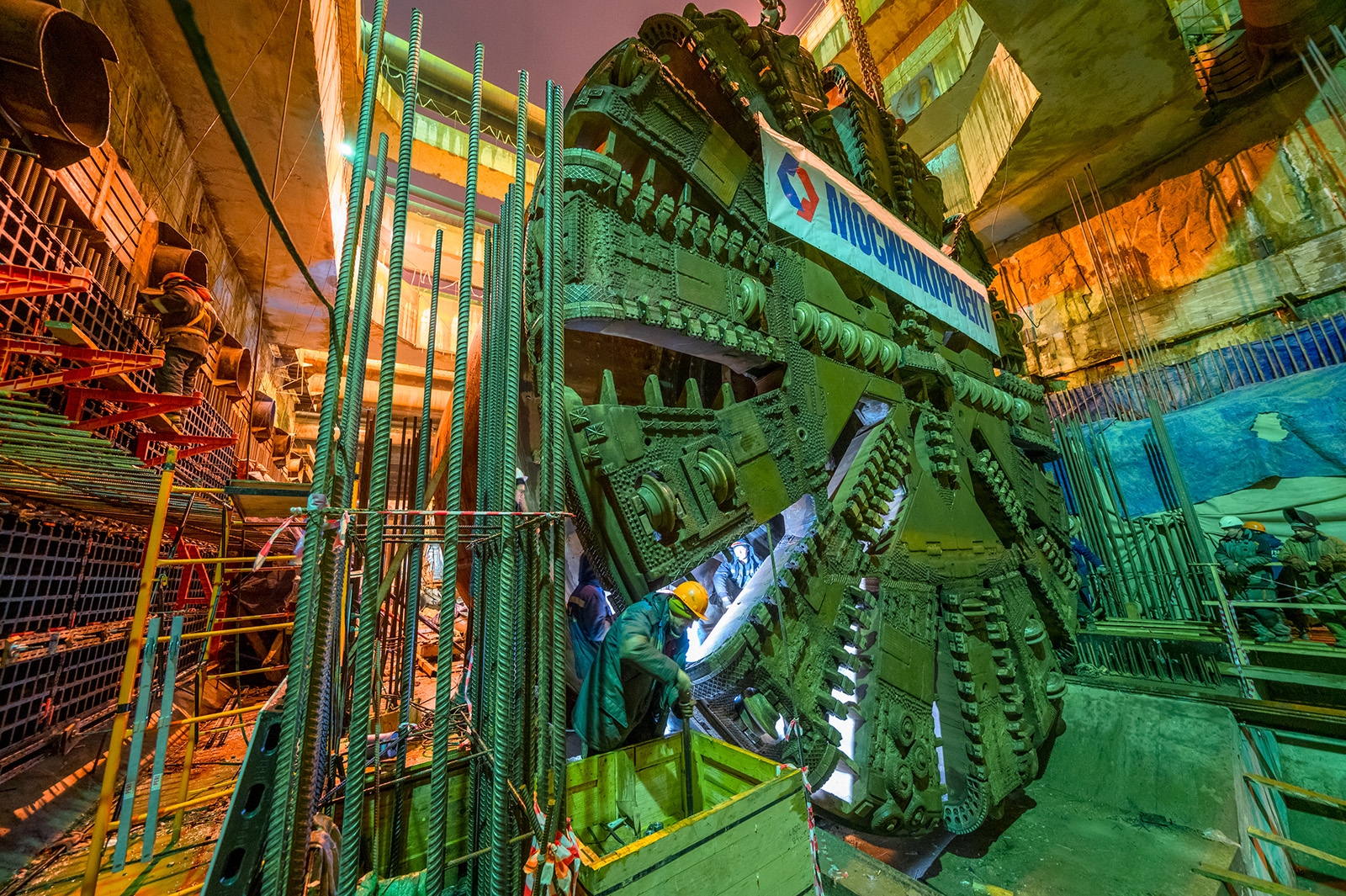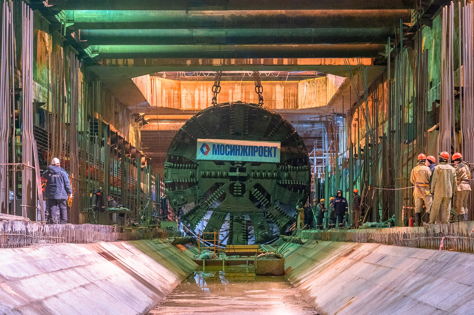 Сборка щита-гиганта – сложный технологический процесс. Сначала на поверхности была проведена укрупненная сборка трех технологических телег тоннелепроходческого механизированного комплекса (ТПМК) весом 90, 150 и 126 тонн, а также сварка 160-тонного ротора. Затем эти элементы опустили в котлован с помощью крана. Головная часть щита весом более 780 тонн опускалась отдельными сегментами и собиралась в котловане.