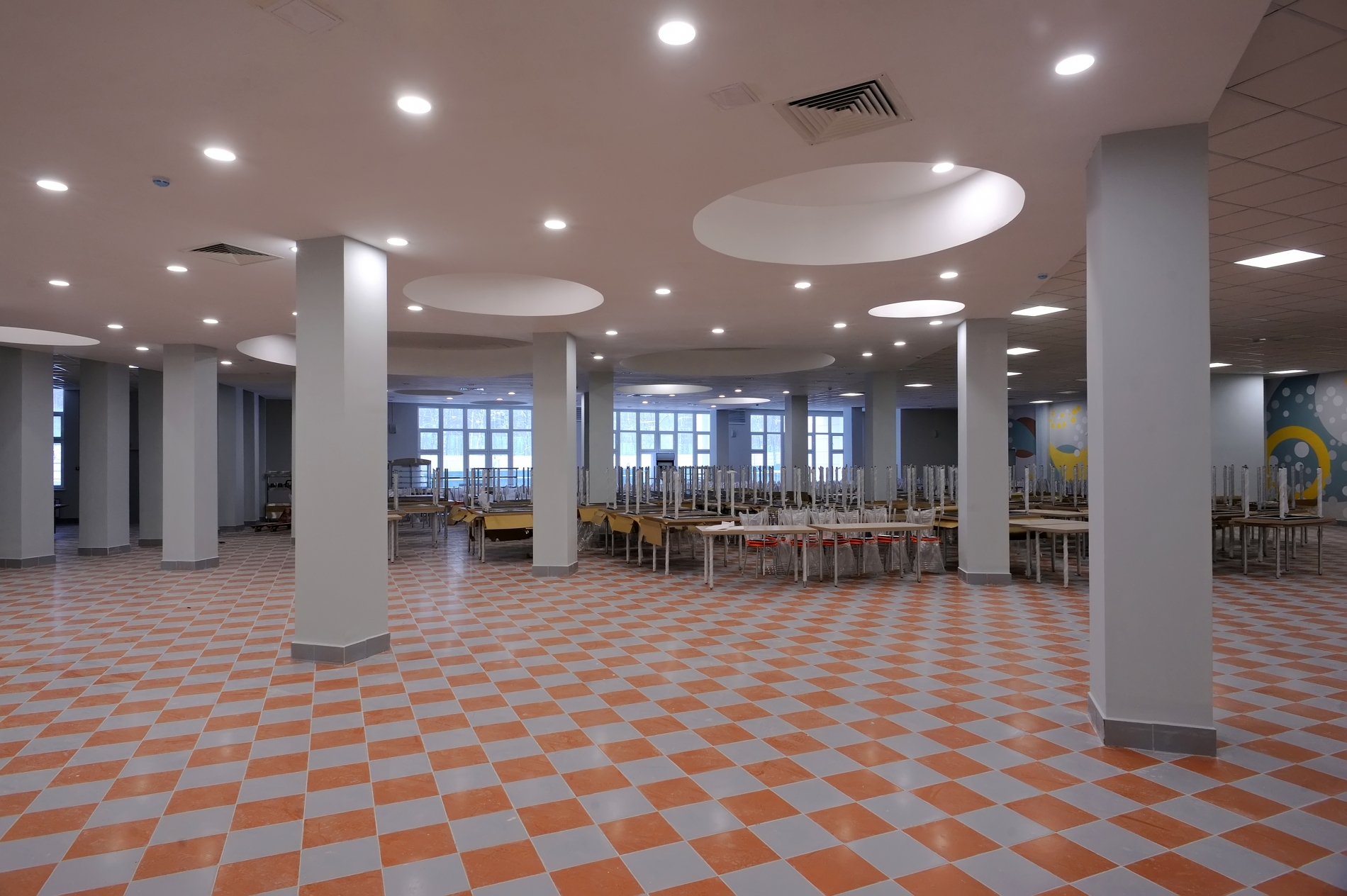 Здание площадью 26 тыс. кв. м имеет внутренний двор, образуемый тремя корпусами; в одном из них размещается начальная школа со своей инфраструктурой – зонами отдыха, игровыми комнатами, помещениями для внеклассных занятий и групп продленного дня. В распоряжении школьников – два актовых зала, пять спортзалов, зал хореографии и 25-метровый бассейн.