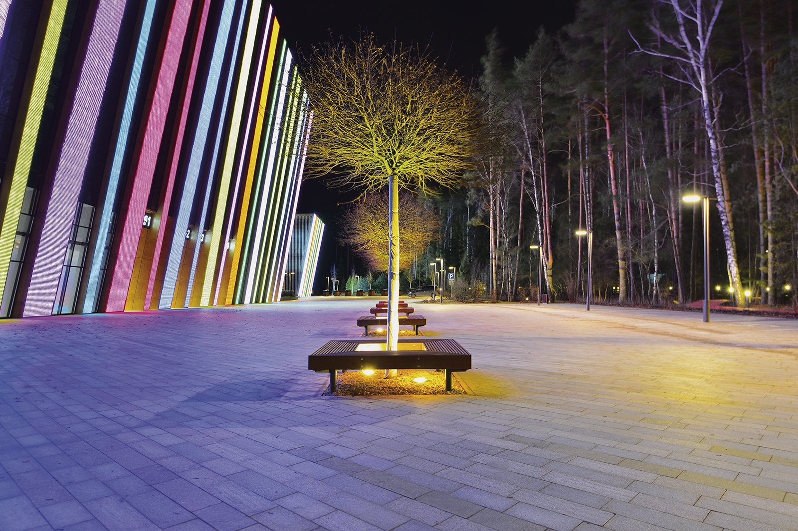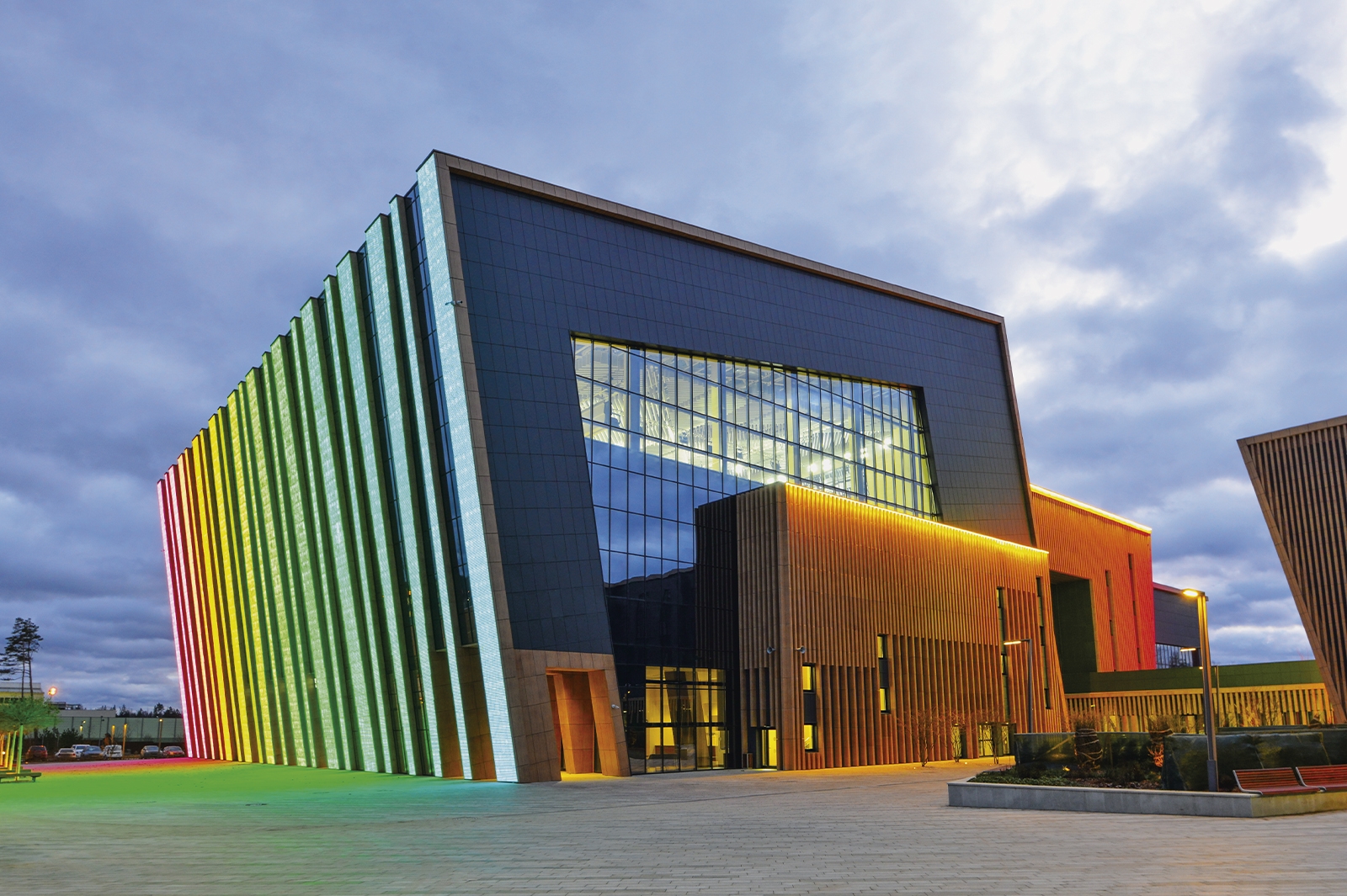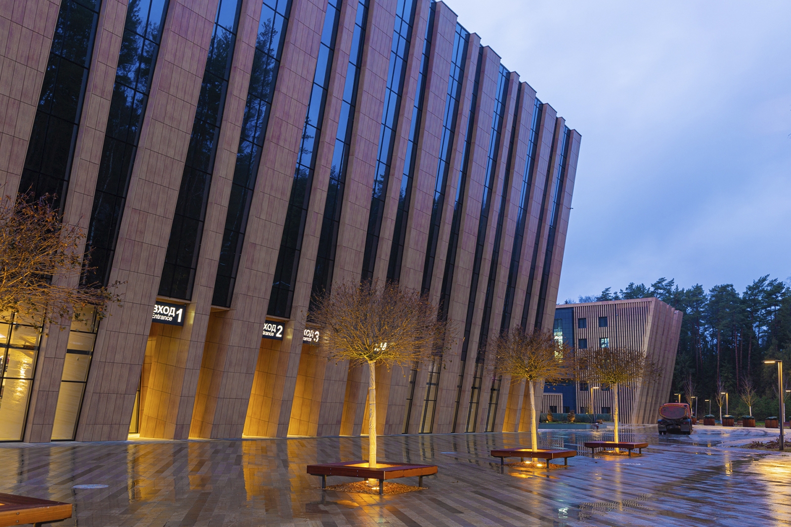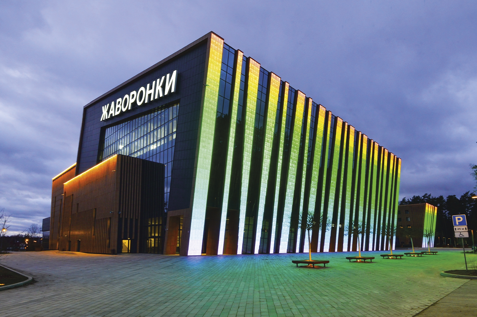 Что касается экстерьера комплекса, то здесь оборудованы медиафасады с интегрированной подсветкой площадью более 1 тыс. кв. метров. Зрителей встречают эффектные входные группы с цветными световыми полосами.