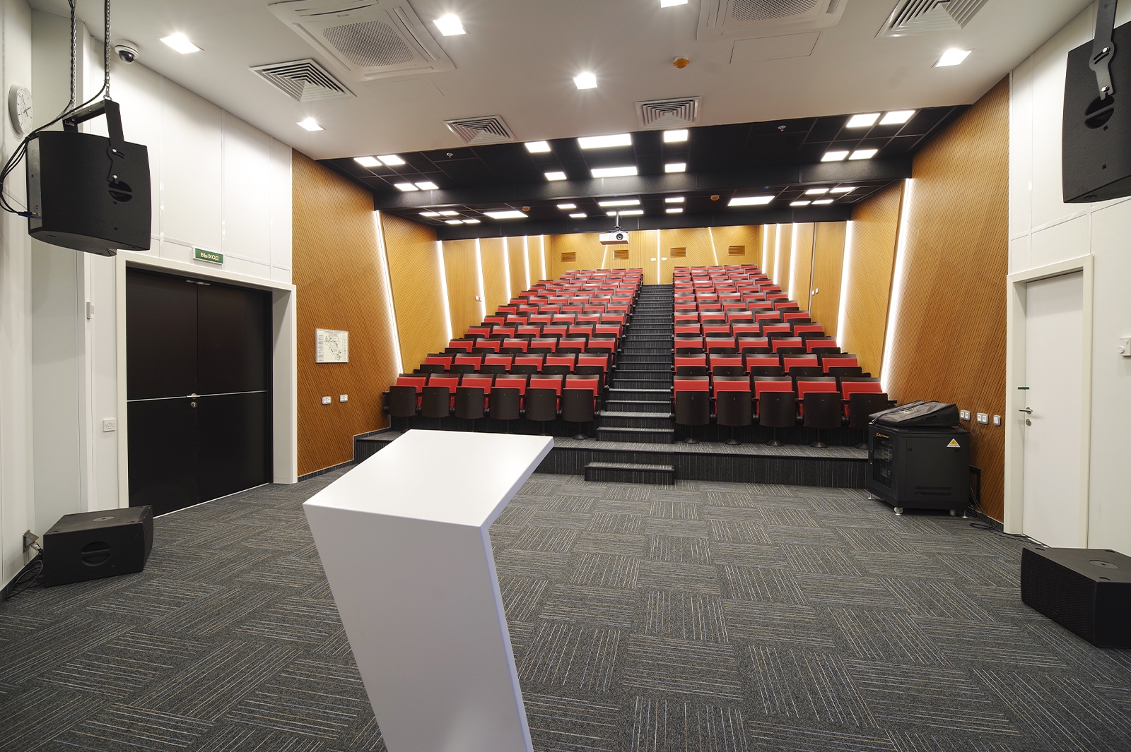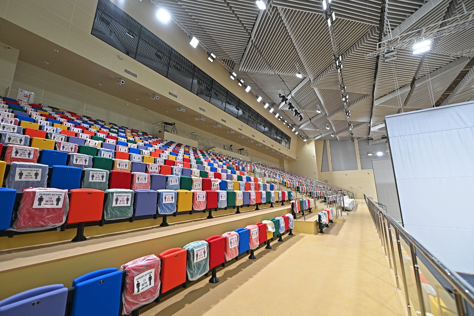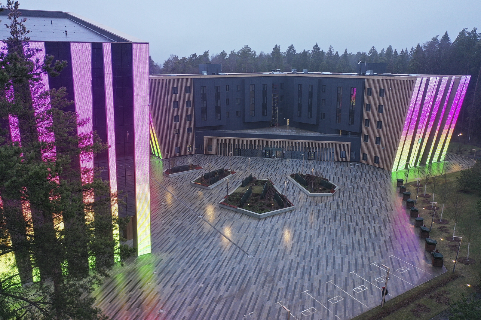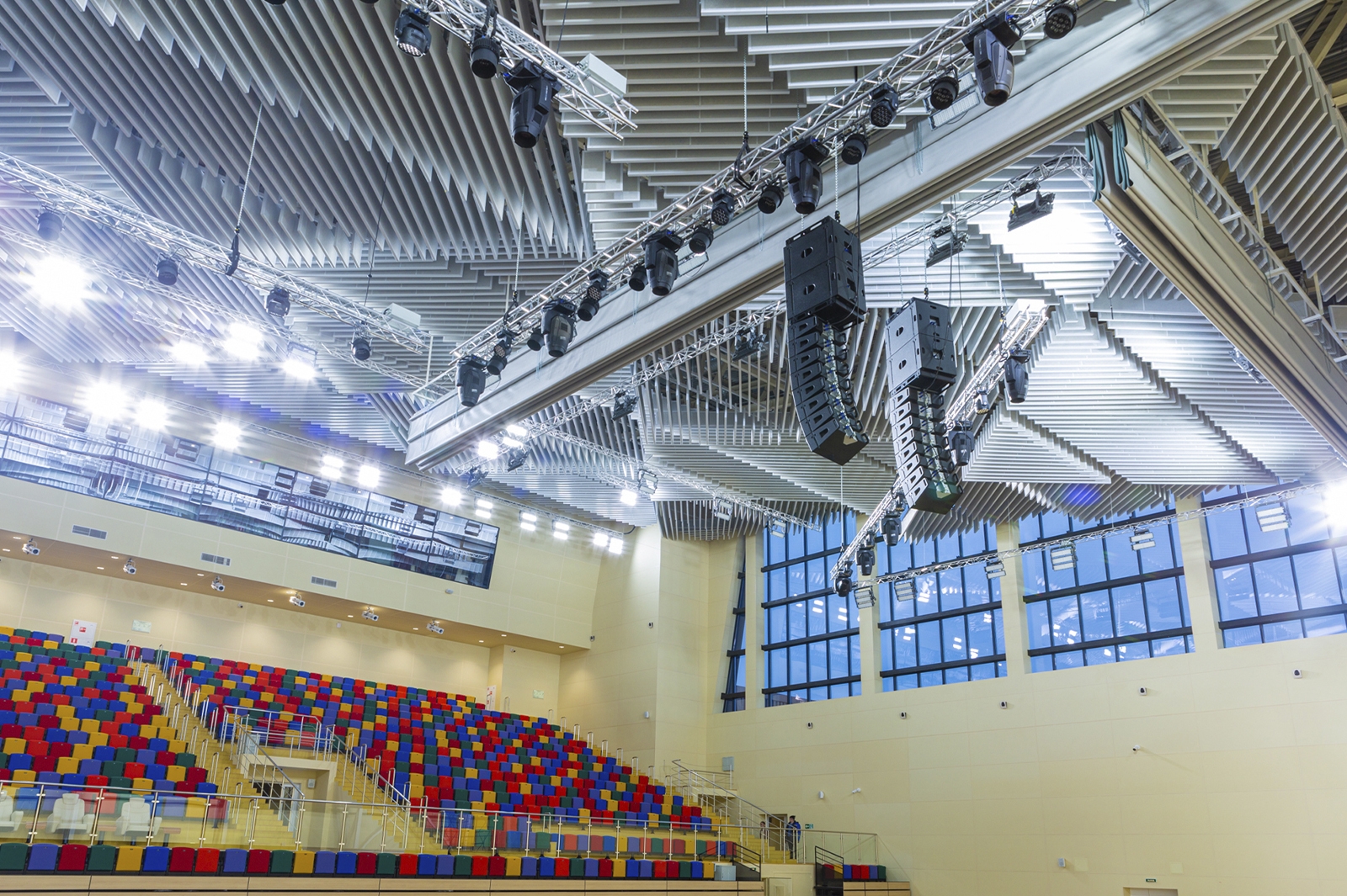 Что касается экстерьера комплекса, то здесь оборудованы медиафасады с интегрированной подсветкой площадью более 1 тыс. кв. метров. Зрителей встречают эффектные входные группы с цветными световыми полосами.