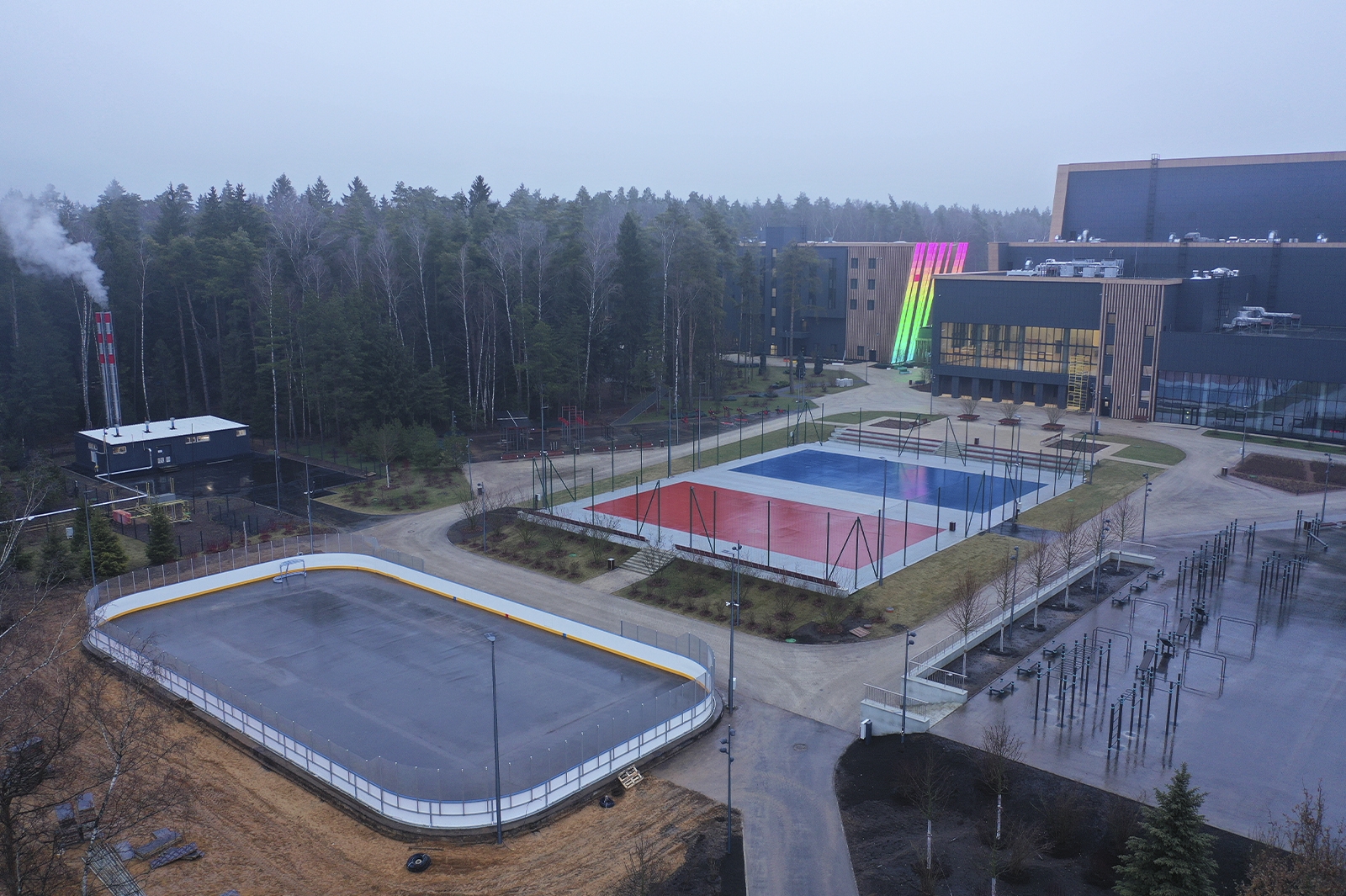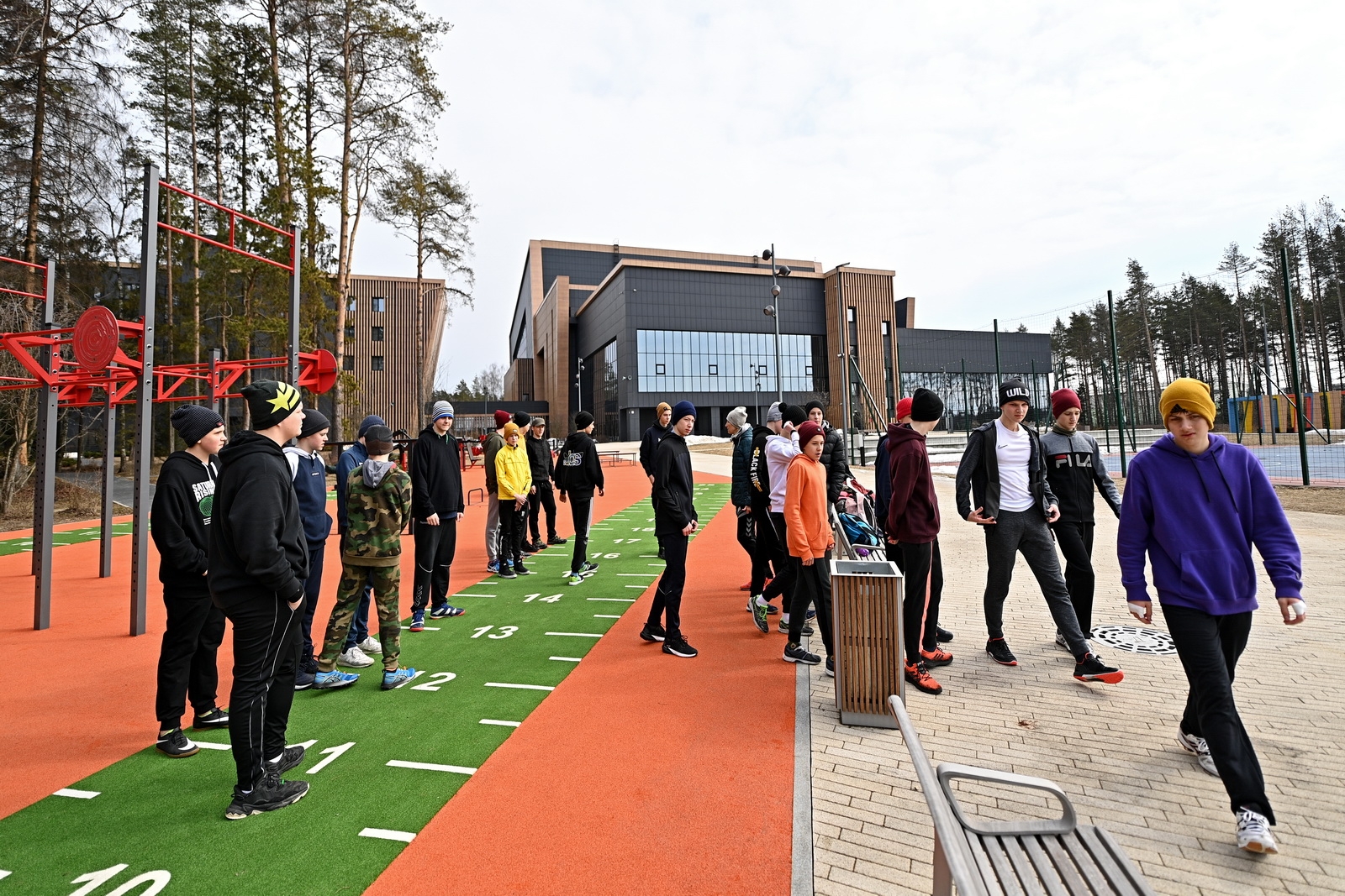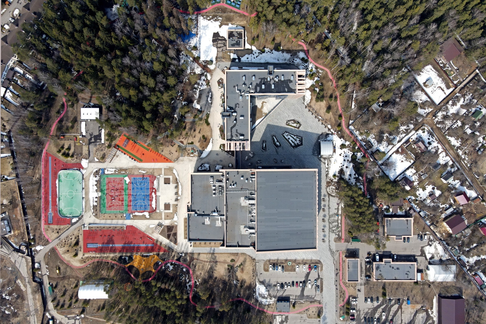 На территории комплекса расположено большое количество разных спортплощадок, в числе которых универсальные игровые, хоккейная, площадки для воркаута и паркура, с уличными тренажерами, крытая спортивная площадка, а также разнообразные зоны отдыха. Среди лесного массива проложена беговая дорожка с кольцевым маршрутом длиной 900 метров.