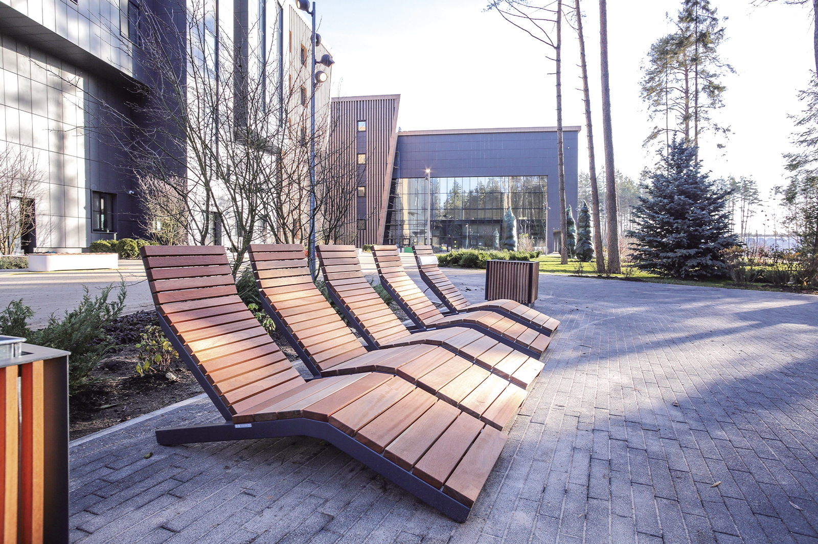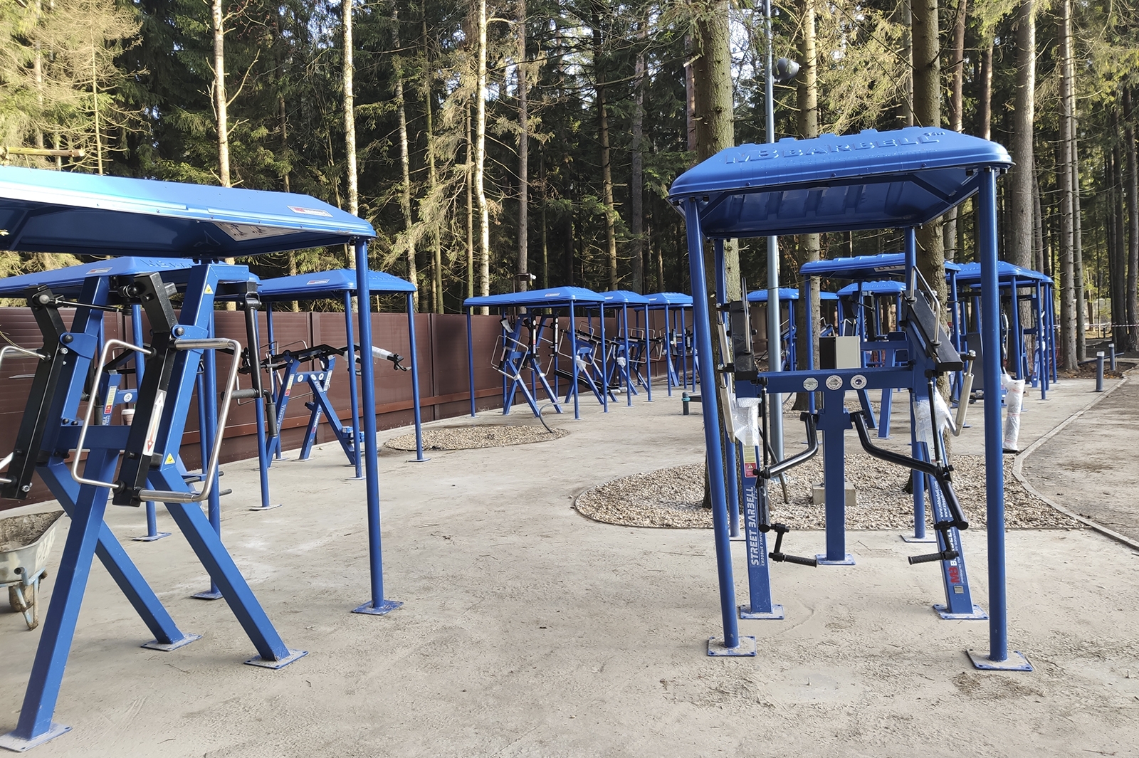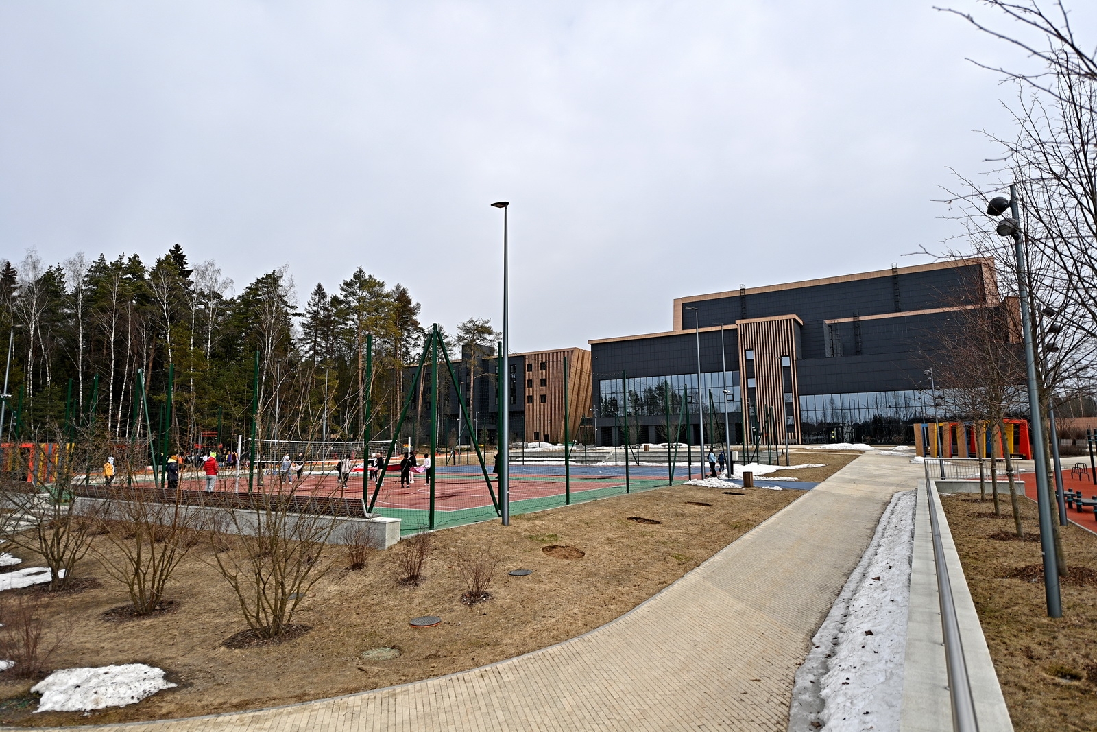 На территории комплекса расположено большое количество разных спортплощадок, в числе которых универсальные игровые, хоккейная, площадки для воркаута и паркура, с уличными тренажерами, крытая спортивная площадка, а также разнообразные зоны отдыха. Среди лесного массива проложена беговая дорожка с кольцевым маршрутом длиной 900 метров.