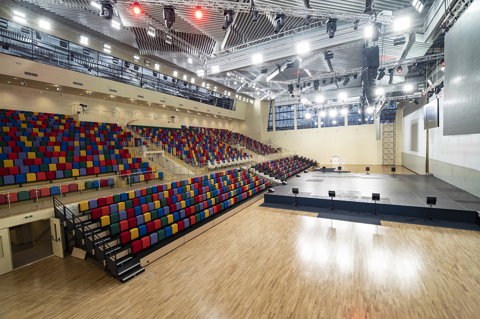 В спорткомплексе есть универсальный зал 48 х 60 метров с высотой потолков 16 метров. Здесь расположены трибуны на две тысячи мест, современное спортивное и мультимедийное оборудование, которое позволяет проводить мероприятия федерального масштаба, а также транслировать их. Кроме того, зал оснашен табло с подъемным механизмом, системой озвучивания концертного класса, акустическим занавесом и автоматическими складывающимися трибунами-блитчерами (телескопические раздвижные трибуны).