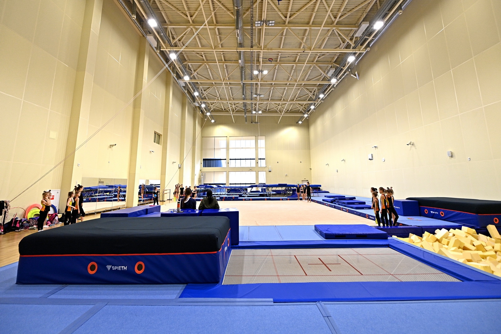 В батутном зале 48 х 24 метра и высотой потолков 12 метров есть две батутные ямы и акробатические лонжи.