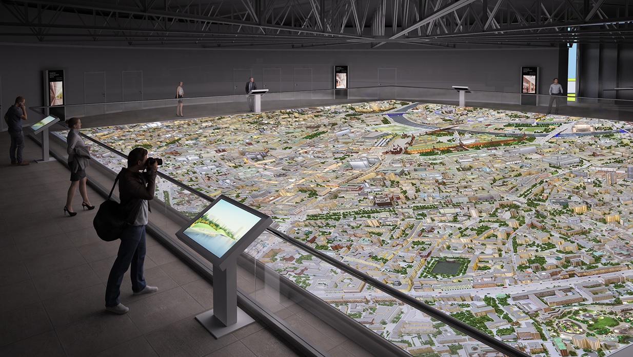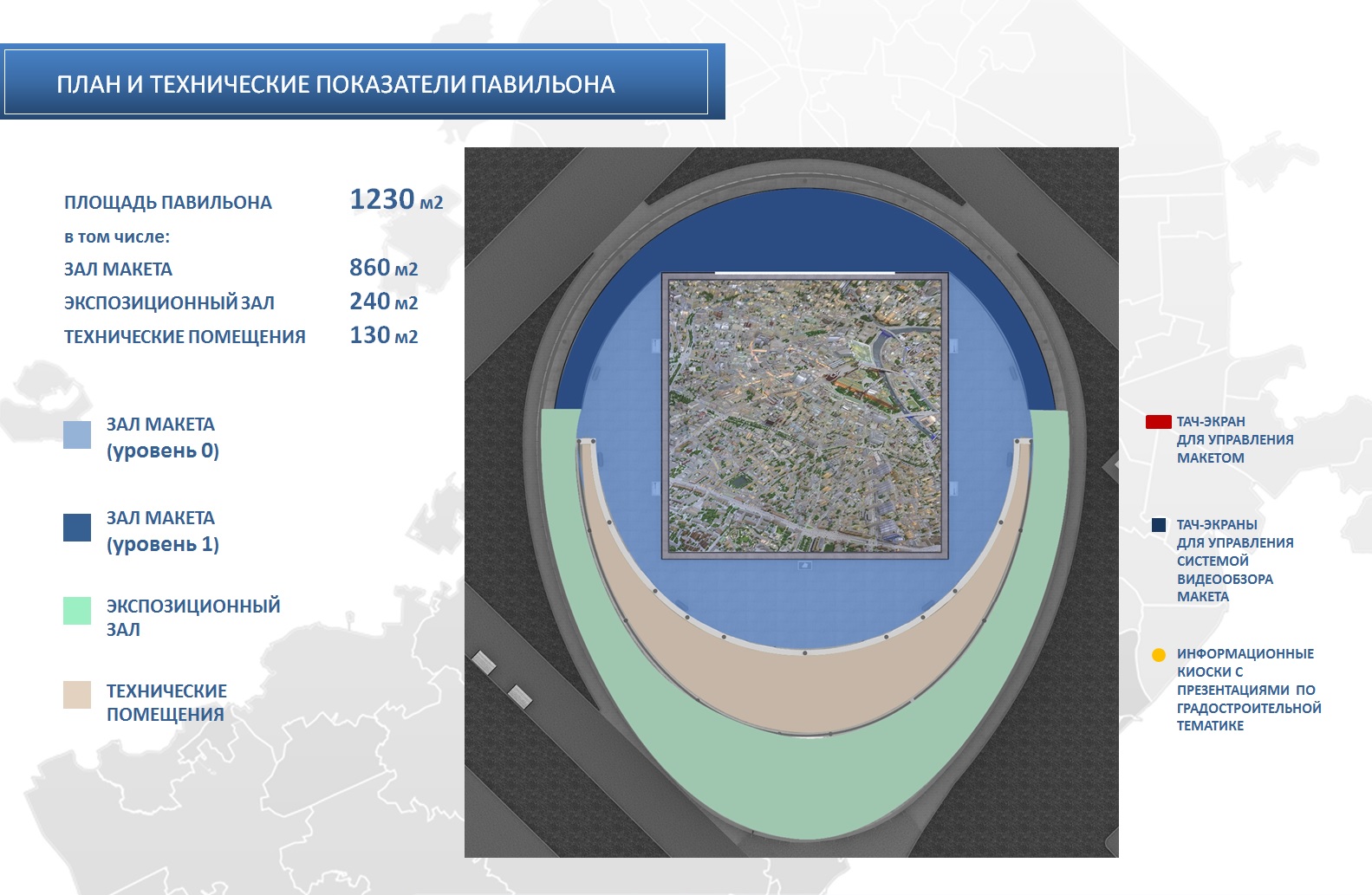 Площадь павильона составит 1230 кв. м. Внутренний зал позволит экспонировать интерактивный макет по мере его увеличения.
