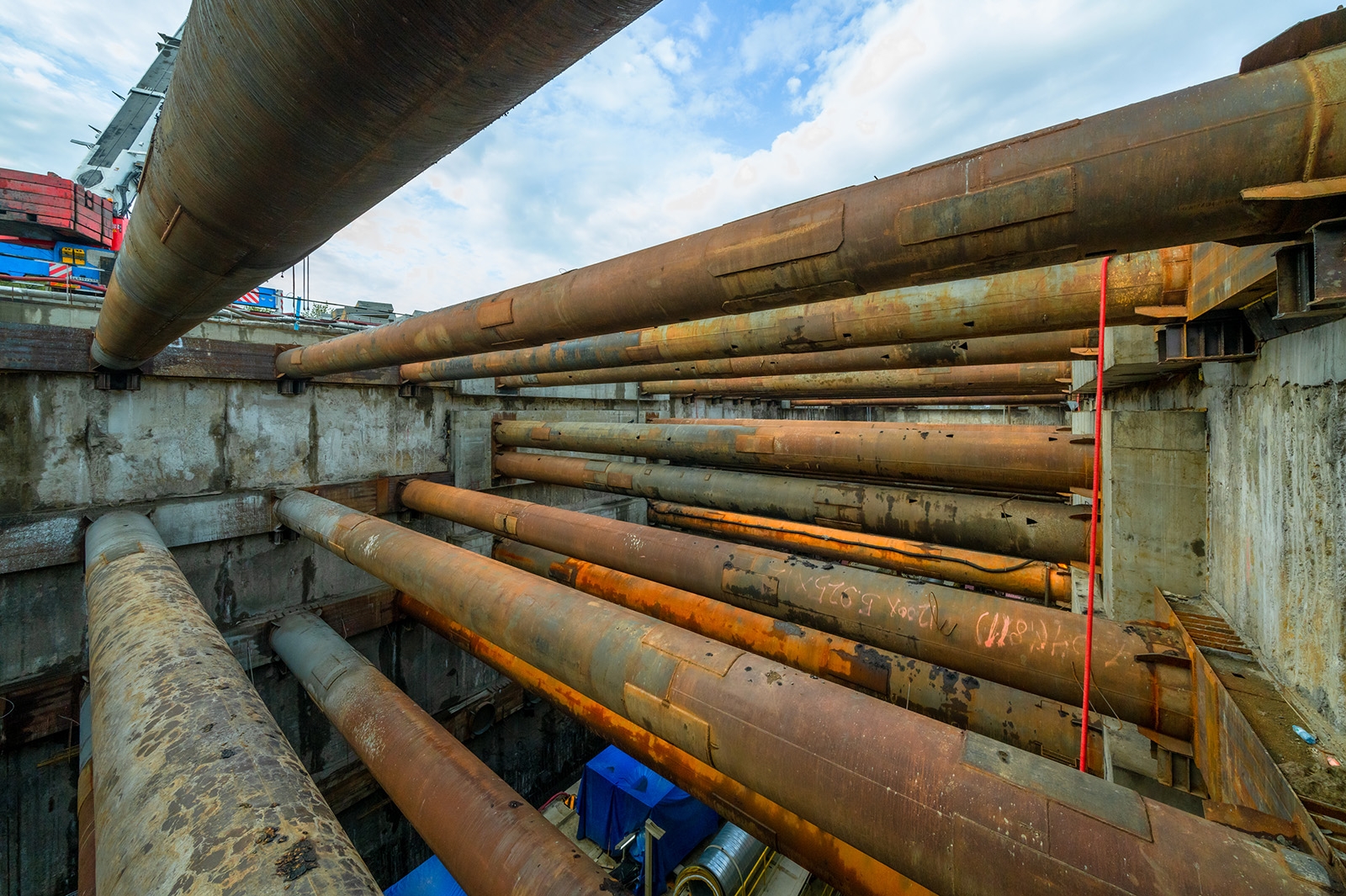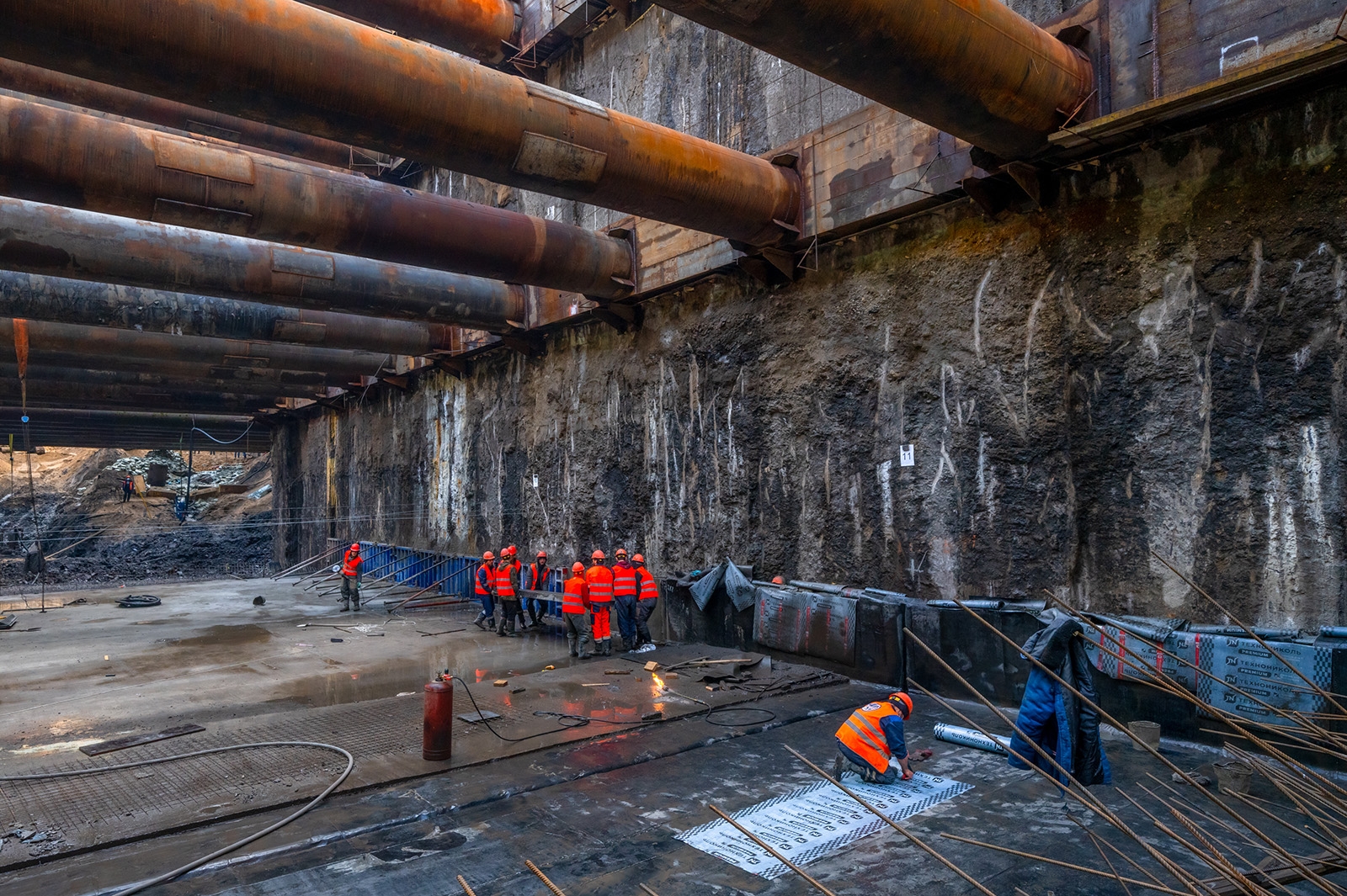 Сейчас на станции разрабатывают грунт котлована и параллельно ведут монтаж его распорной системы. С помощью метода «стена в грунте» сооружается ограждающая конструкция котлована.