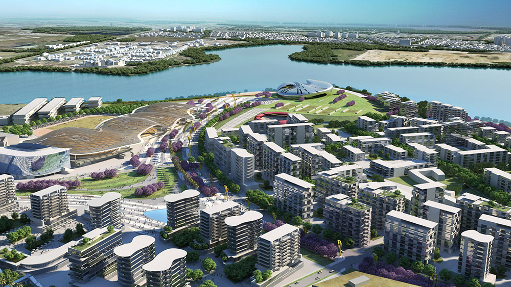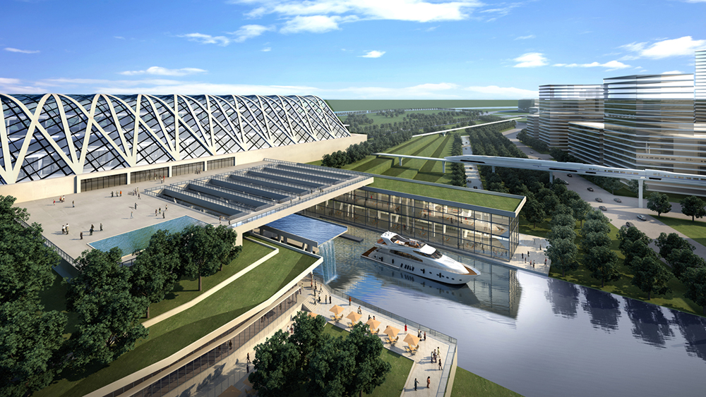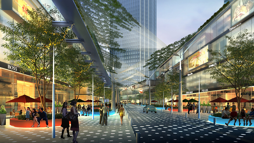 Центральный элемент и основной символ будущего китайского делового района - «П»-образное здание с огромной аркой. Перед ним организуют площадь, которая будет примыкать к озеру. Продолжением площади станет круговое обрамление озера, в центре которого установят фонтаны. В основу проекта делового района легла концепция пяти кругов - леса, города, парка, воды и культуры.