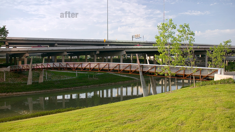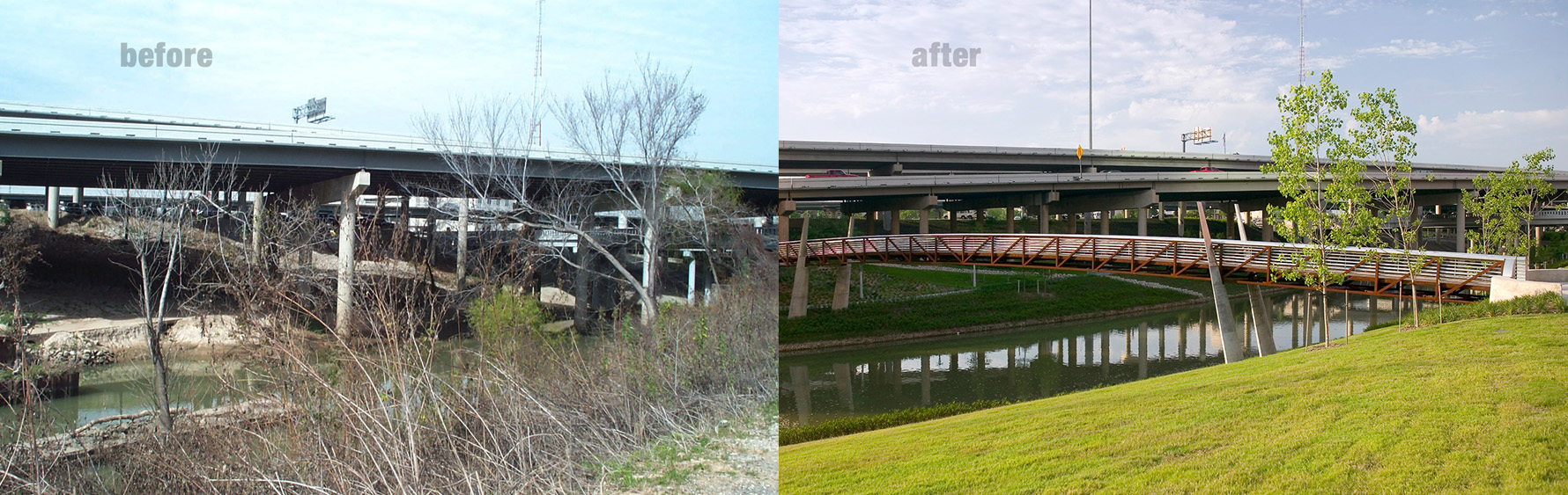 Это крупнейший инвестиционный проект общественного парка в Хьюстоне. Пешеходный маршрут Buffalo Bayou соединяет центр города с парком у реки. Раньше эта территория была в запущенном состоянии и не справлялась с наводнениями. Проблема встала особо остро, когда начал проседать грунт. Тогда и было принято решение реконструировать заброшенные природные каналы в окружении улиц и магистралей.