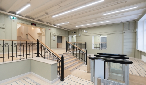 Новый учебный корпус школы «Интеграл» построили в районе Филёвский Парк на западе столицы. Дорога к знаниям здесь начинается с самого оформления здания: математические формулы нанесены прямо на ступени, а многофункциональное многосветное пространство украшено макетами планет Солнечной системы.