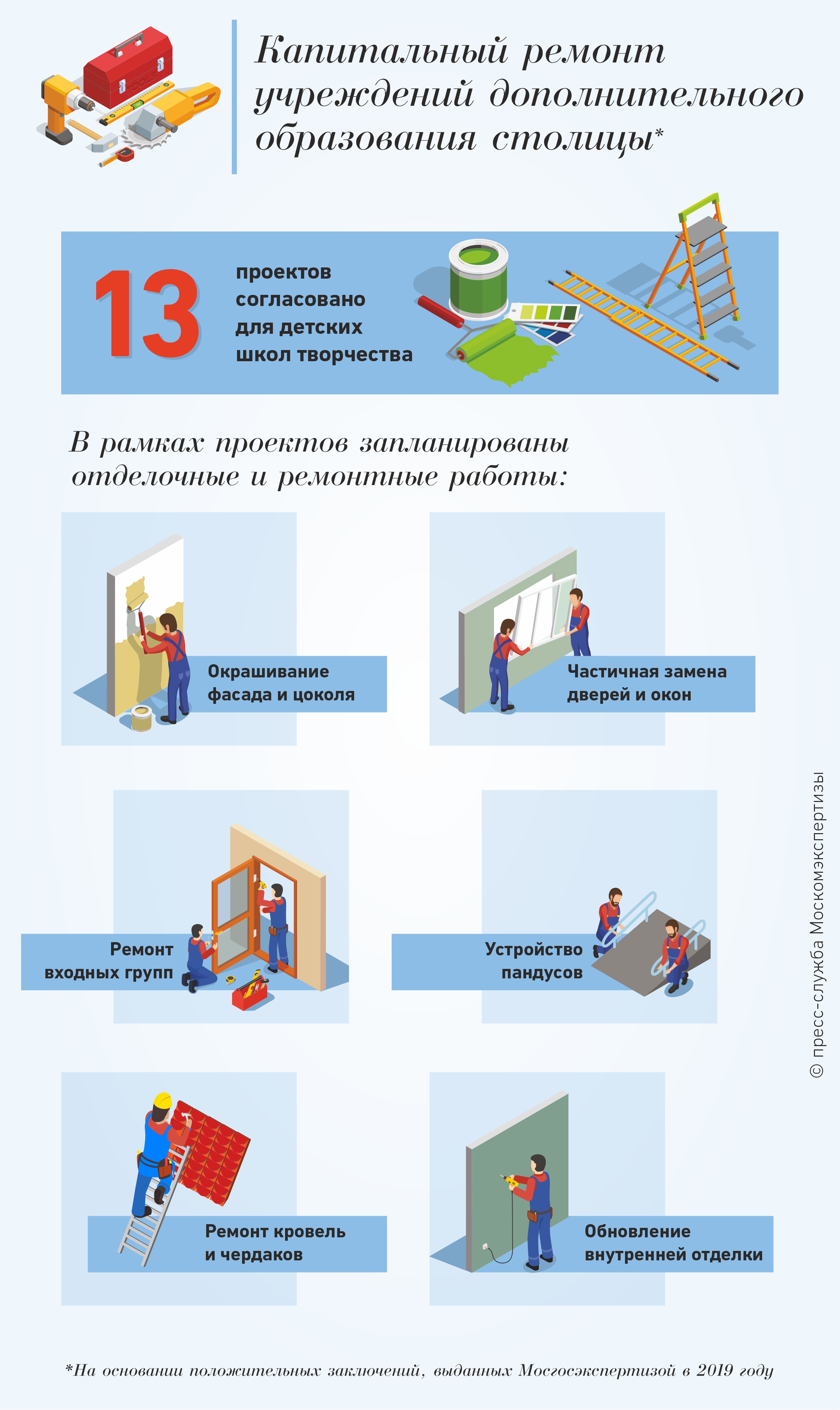 «Сегодня в столице активно реализуется масштабная программа «Искусство – детям», которая предусматривает капитальный ремонт устаревших зданий, закупку новых музыкальных инструментов, оборудования и мебели, а также оснащение учебных заведений всем необходимым для организации творческого процесса. Мосгосэкспертиза на постоянной основе проводит экспертизу проектов на проведение капитального ремонта и планомерное обновление материально-технической базы образовательных учреждений», – сообщили в ведомстве.