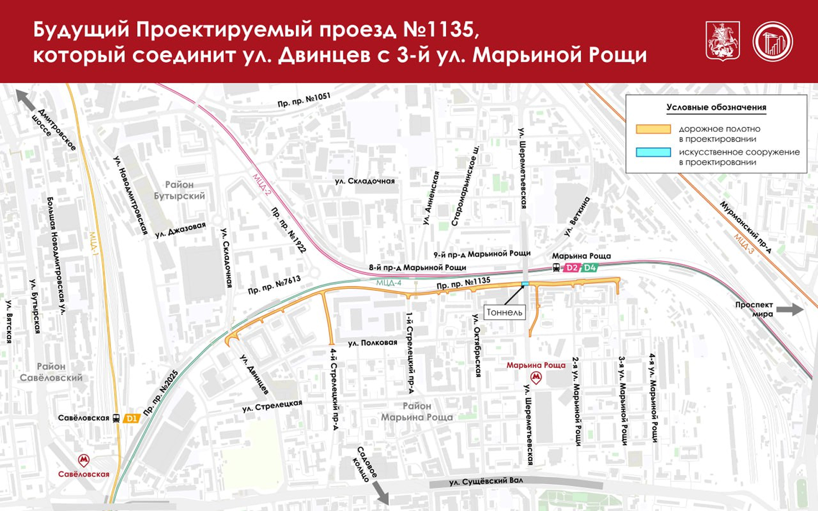 Проектируемый проезд № 1135 вдоль путей второго и четвертого Московского центрального диаметра соединит ул. Двинцев и 3-ю ул. Марьиной Рощи на северо-востоке столицы.