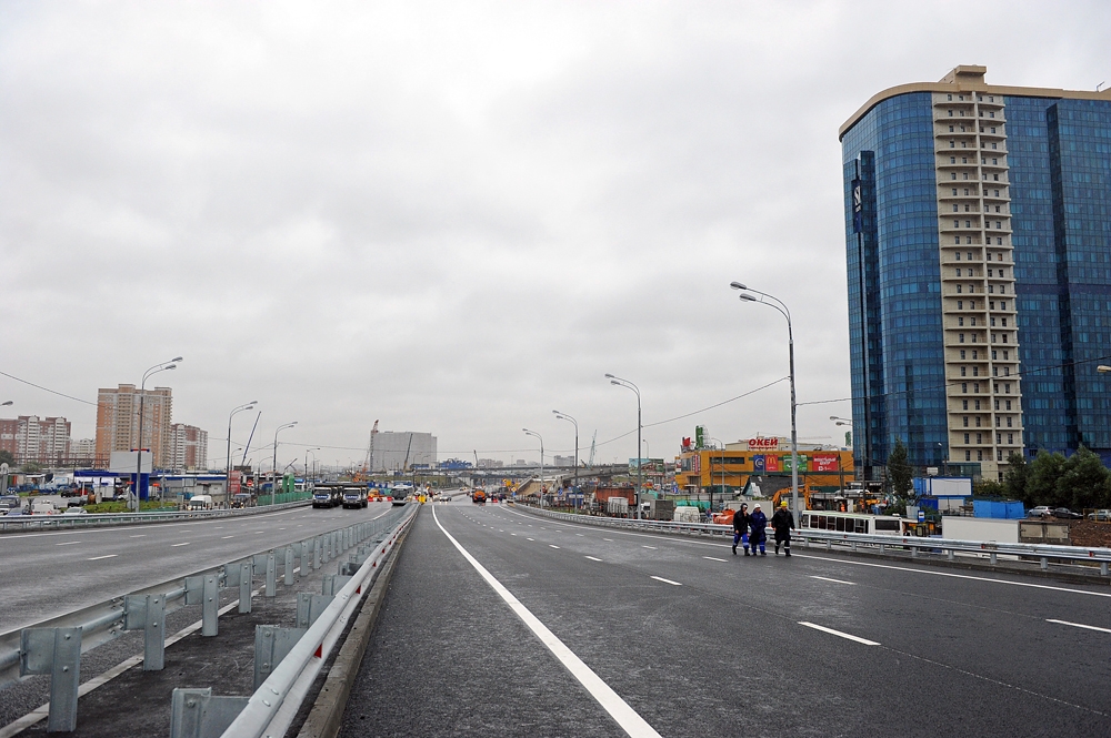 Здесь построили 6,6 км дорог, в том числе эстакаду, тоннель, два моста через реку Сетунь, два подземных пешеходных перехода и один надземный.
