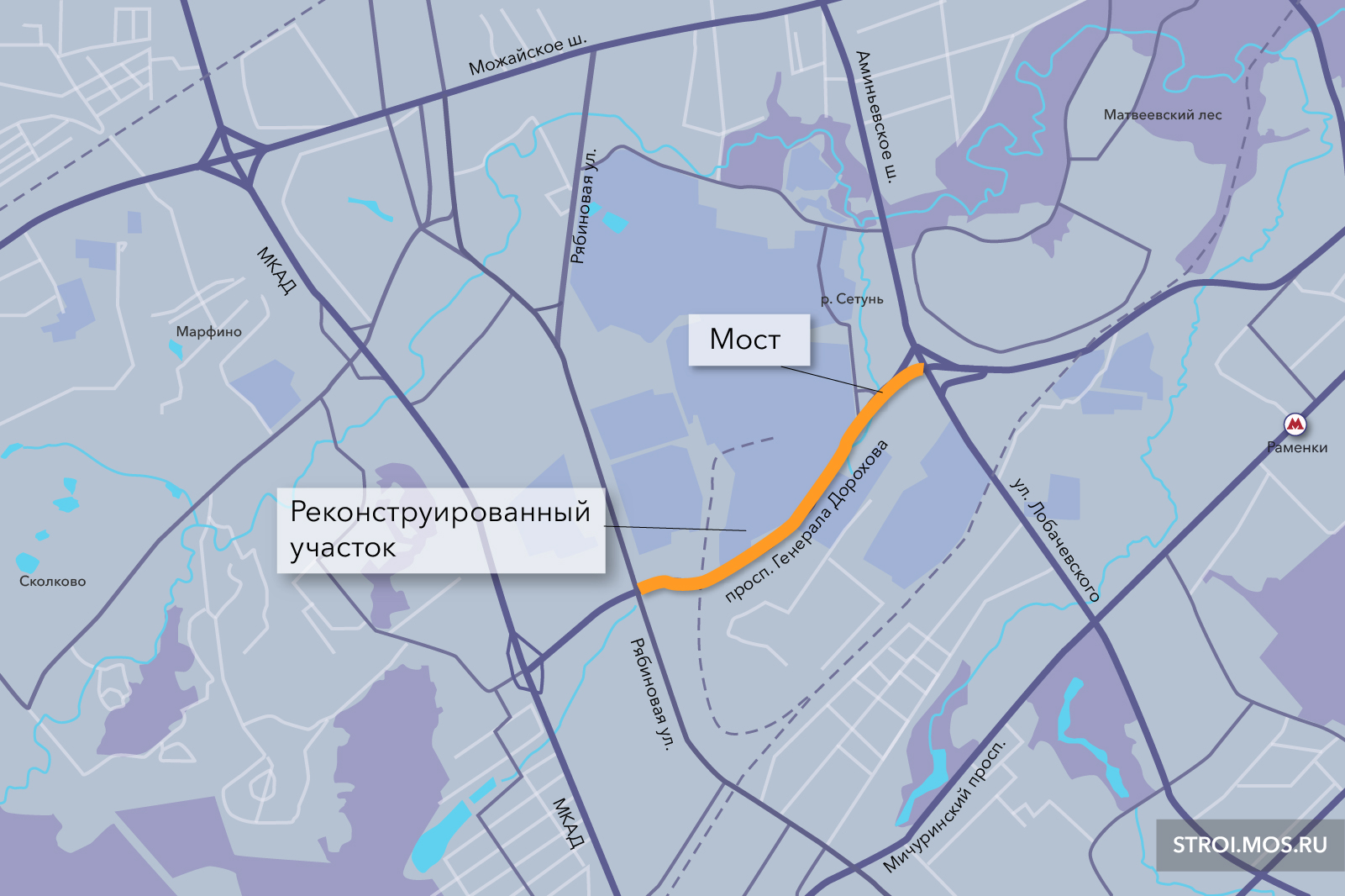 Сколковское шоссе расширили и построили эстакаду на пересечении с ул. Вяземская и Витебская. Возвели разворотную эстакаду с Рябиновой улицы и мост через реку Сетунь.