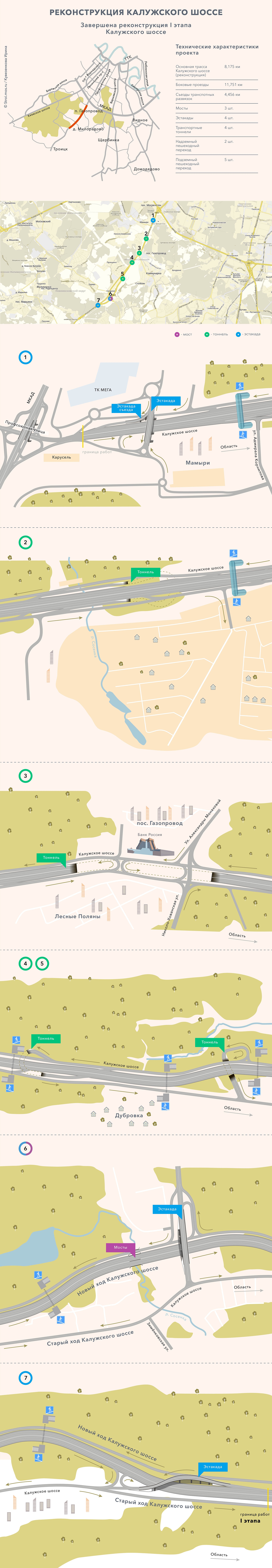 - 6,7 км основного хода по Калужскому шоссе (по 3-4 полосы для движения в каждом направления);