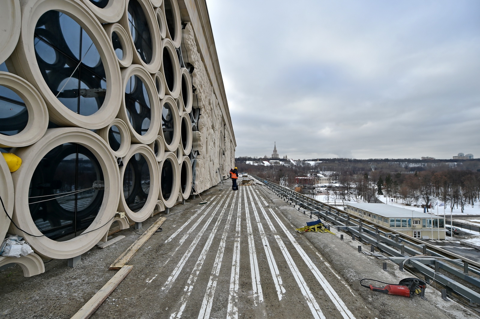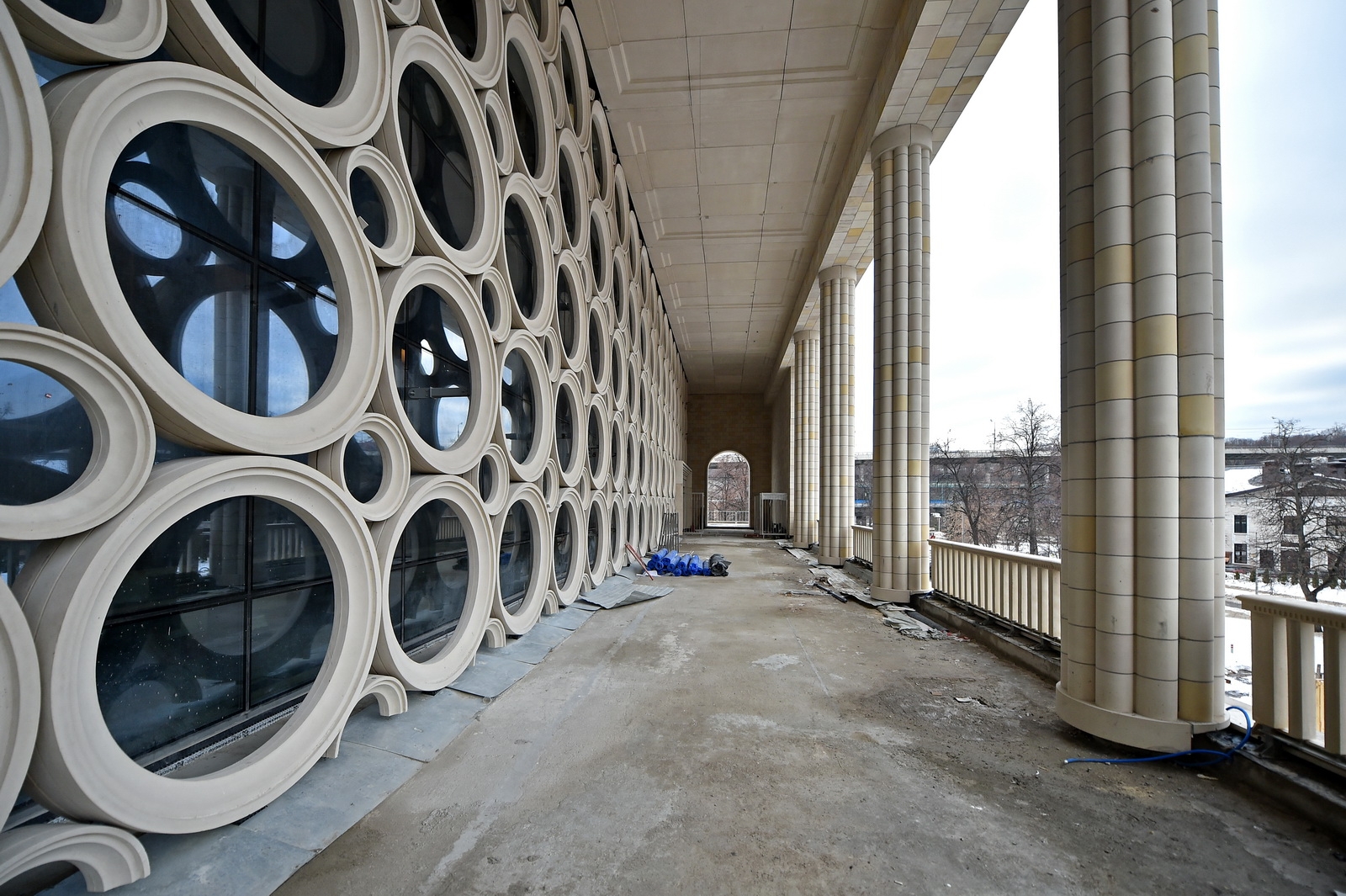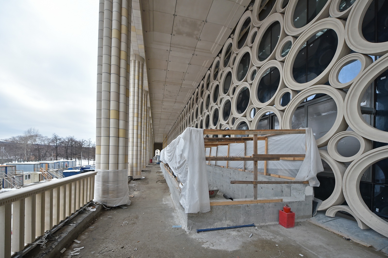 Уникальные барельефы, украшавшие фасад бассейна, сохранили и сделали частью интерьера. На здание повесили копии из фибробетона. Появились и олимпийские кольца – как отсылка к Олимпиаде-80, на которой советская сборная в стенах старого бассейна завоевала золотые медали. Кроме того, воссоздана и аутентичная колоннада.