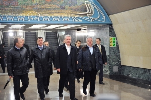 Осмотр второго вестибюля станции "Марьина роща" Люблинско-Дмитровской линии метрополитена. С. Собянин, М. Хуснуллин, А. Бочкарев